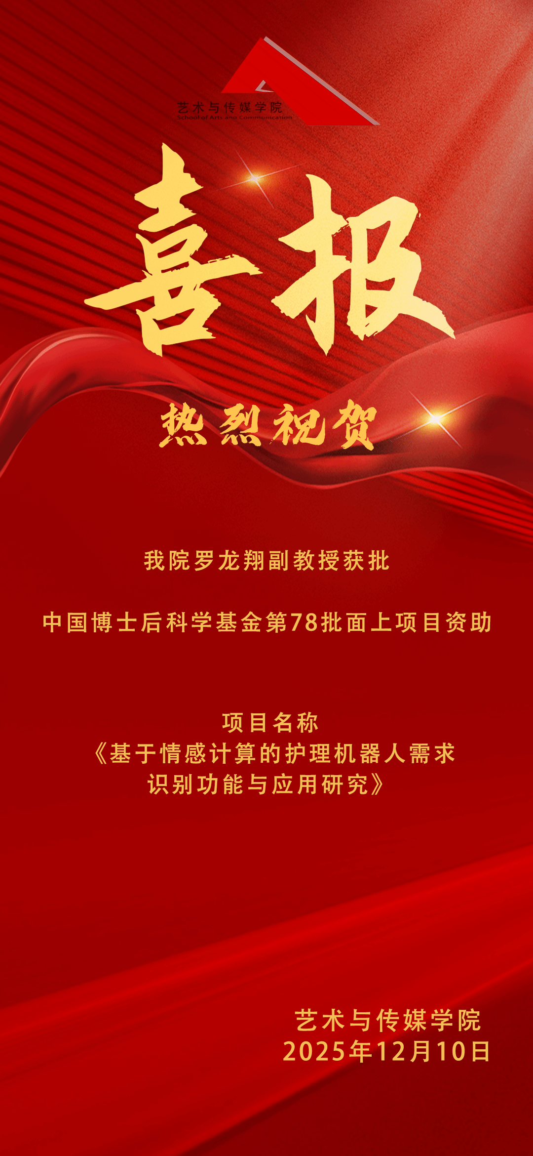 2025年12月8日获悉,中国博士后科学基金会公布了第78批面上项目资助名单。我院新闻传播系副教授、自动化学院博士后罗龙翔申报的项目《基于情感计算的护理机器人需求识别功能与应用研究》喜获资助,充分彰显了我院教师在新闻传播学前沿探索与跨学科融合方面的积极成效。