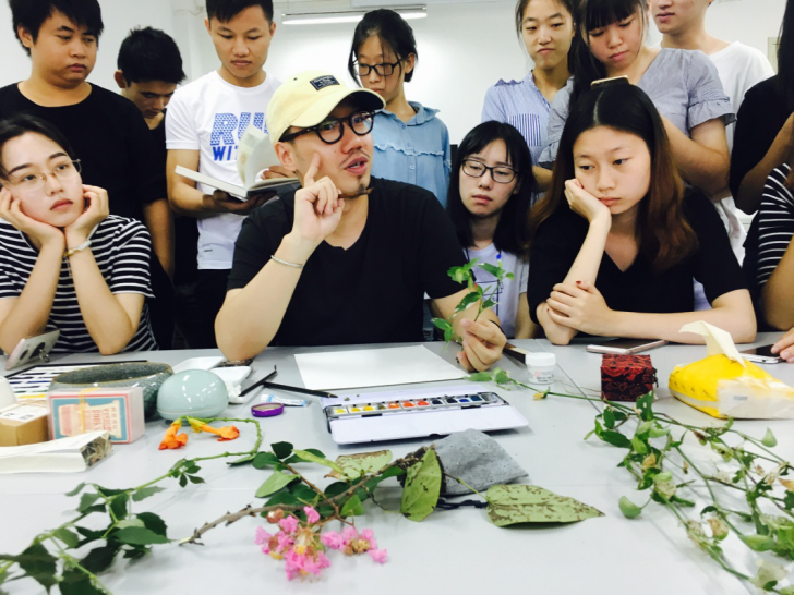 介疾老师骨子里自带的幽默感和接地气的谈吐让他的讲座增添了几分亲切感。从诗经出发介绍诗经中植物的一些传说或者故事及介绍植物的特性,拉家常式的开篇聊到作画应 “小画用大笔”、“大画用小笔”,还为同学们介绍了绘画古风水彩植物所需的工具毛笔和水彩颜料的使用,最后他结合示范与讲解五步法和对比色的交融在画面调色的运用为同学们现场展示了对花与叶子细腻而贴切的诠释。