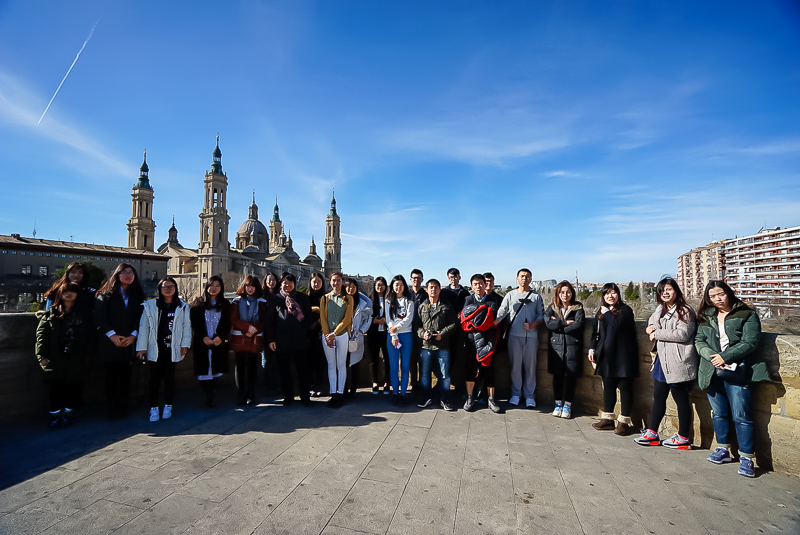 中午12点25分,访学团抵达萨拉戈萨,并做短时休整。随后,访学团在马林老师的带领下前往皮拉尔圣母大教堂进行参观。皮拉尔圣母大教堂始建于17世纪,呈典型的巴洛克式建筑风格,教堂入口设置在广场的一侧,而广场的另一侧立着戈雅的塑像。对于戈雅,马林老师表示:“戈雅是西班牙浪漫主义画派画家,早期曾服务于王室,画风奇异多变,皮拉尔圣母大教堂大殿的两个伟大壁画上亦留下了他的遗迹。”此外,他还表示:“戈雅早期画风是绘制生活中的美好,而后来,国家衰败,经济萧条,社会凄凉,这种落差导致了戈雅后期画风大转向。他的画风开始变得阴沉黑暗,所绘图案十分可怖。但亦是由于这种转变,这才最终成就了戈雅。对于西班牙来说,他相当于拉斐尔之于意大利,地位十分崇高”。语毕,马林老师带领访学团进入教堂内部,并示意访学团成员噤声自行观赏。