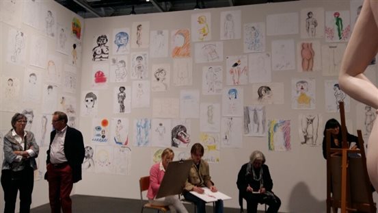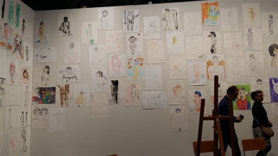 该展区还有很多作品注重互动性,召唤参观者参与。如英国艺术家david shrigley的作品《life model》,在展区中间安放一个比例夸张的人体模特,四周摆满了画架,邀请参观者写生。参观者的作品被贴在四面墙上,成为作品的一部分。当代艺术系教师也饶有兴趣的加入其中,共同赋予作品意义。