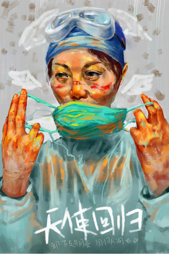 (设计说明:这副作品通过明暗、色彩饱和度对比来突出了医生与病毒之间的抗争。左下角代表祖国的大好河山,医生用脚步走遍且不间断的前行,不问归期。而在画面上方是黑暗的病毒,医生的到来燃起生命的光芒,驱赶着这些病毒…这副作品表达了对医务人员的赞叹和暗示他们的光明前程。)