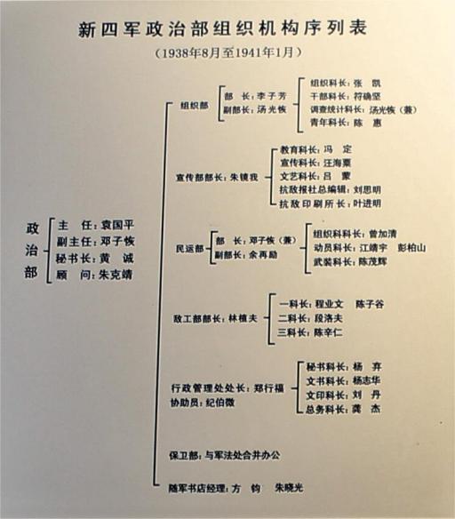 及该展板内《新四军政治部组织机构序列表》部分放大图(右)