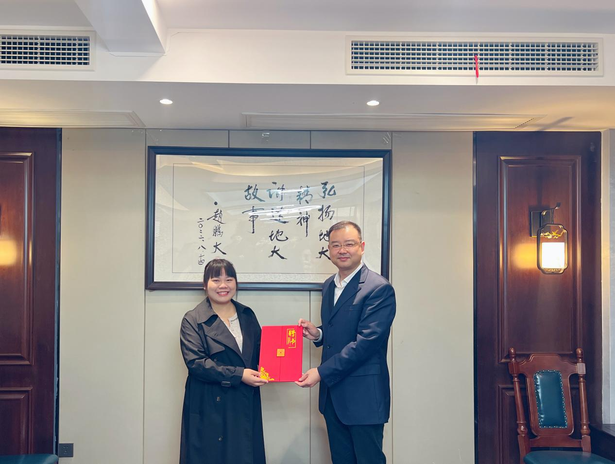 (晋曦、边建华为校友周红桥、周伶俐、罗敏颁发校友之家建设负责人聘书)