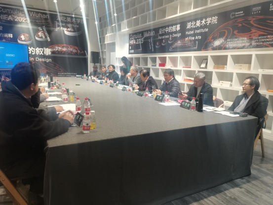 2023年11月28日下午14:20-18:00在湖北美术学院昙华林校区美术馆会议室举行了主题为“新时代设计学科建设的思考”的圆桌会议,同济大学范圣玺教授和苏州大学李海明教授共同主持本次圆桌会议,出席此次会议的还有国务院学位委员会第八届设计学学科评议组成员、教育部工业设计专业教学指导分委员会秘书长、湖南大学设计艺术学院院长季铁教授,湖北美术学院党委常委曹丹教授。参与此次圆桌会议发言的还有武汉理工大学艺术与设计学院院长吕杰峰教授、华中科技大学建筑与城市规划学院设计学系主任白舸教授、浙江工业大学设计与建筑学院学科负责人田密蜜教授、湖北大学艺术学院院长许开强教授、武汉科技大学艺术与设计学院院长管家庆教授、湖北工业大学艺术与设计学院副院长王欣教授,以及湖北美术学院视觉艺术设计学院、环境艺术设计学院、时尚艺术设计学院、工业设计学院和手工艺学院的专家。