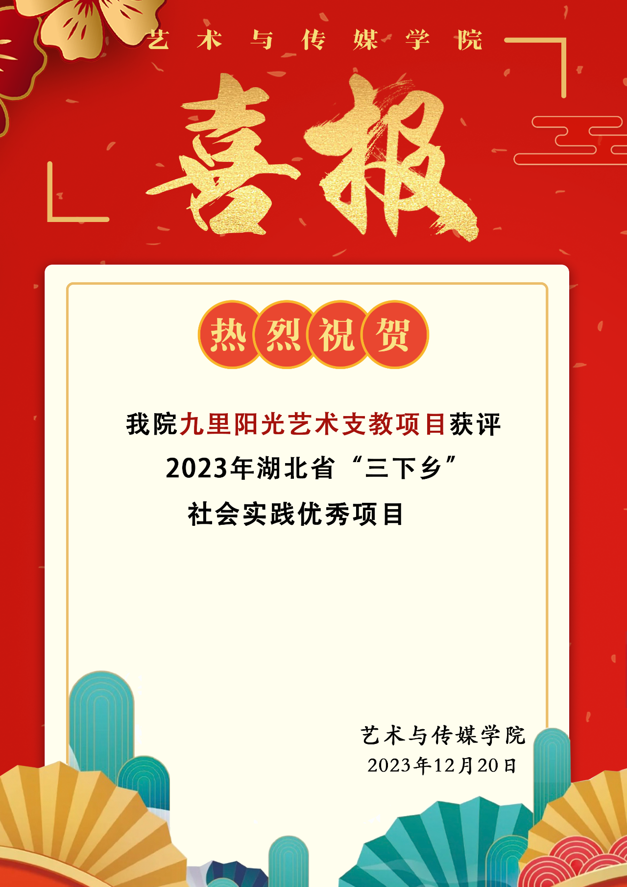 近日,由省文明办、团省委、省教育厅、省乡村振兴局、省学联等单位组织的2023年湖北省大中专学生志愿者暑期“三下乡”社会实践活动先进集体及个人评选结果揭晓,2025最新吃瓜泄密事件九里阳光艺术支教项目获评省级社会实践优秀项目!