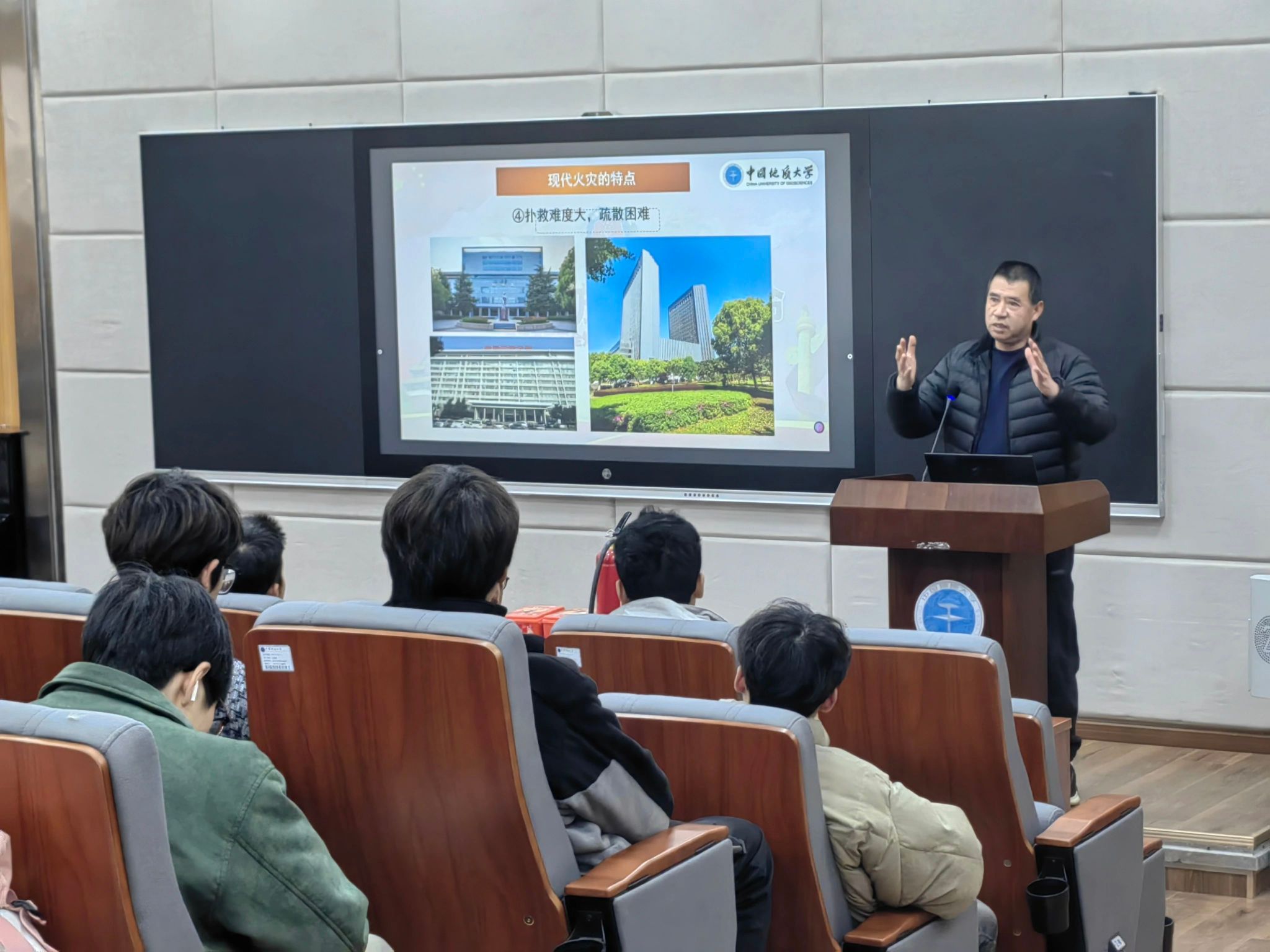 首先,安全保卫部消防科刘从贵科长对学生进行《消防安全知识》教育。他通过火灾构成要素、火场逃生自救方法、常见消防器材的使用等方面进行讲授,并结合我校发生的火灾事故现场照片、视频,提醒大家掌握必备的消防安全知识。