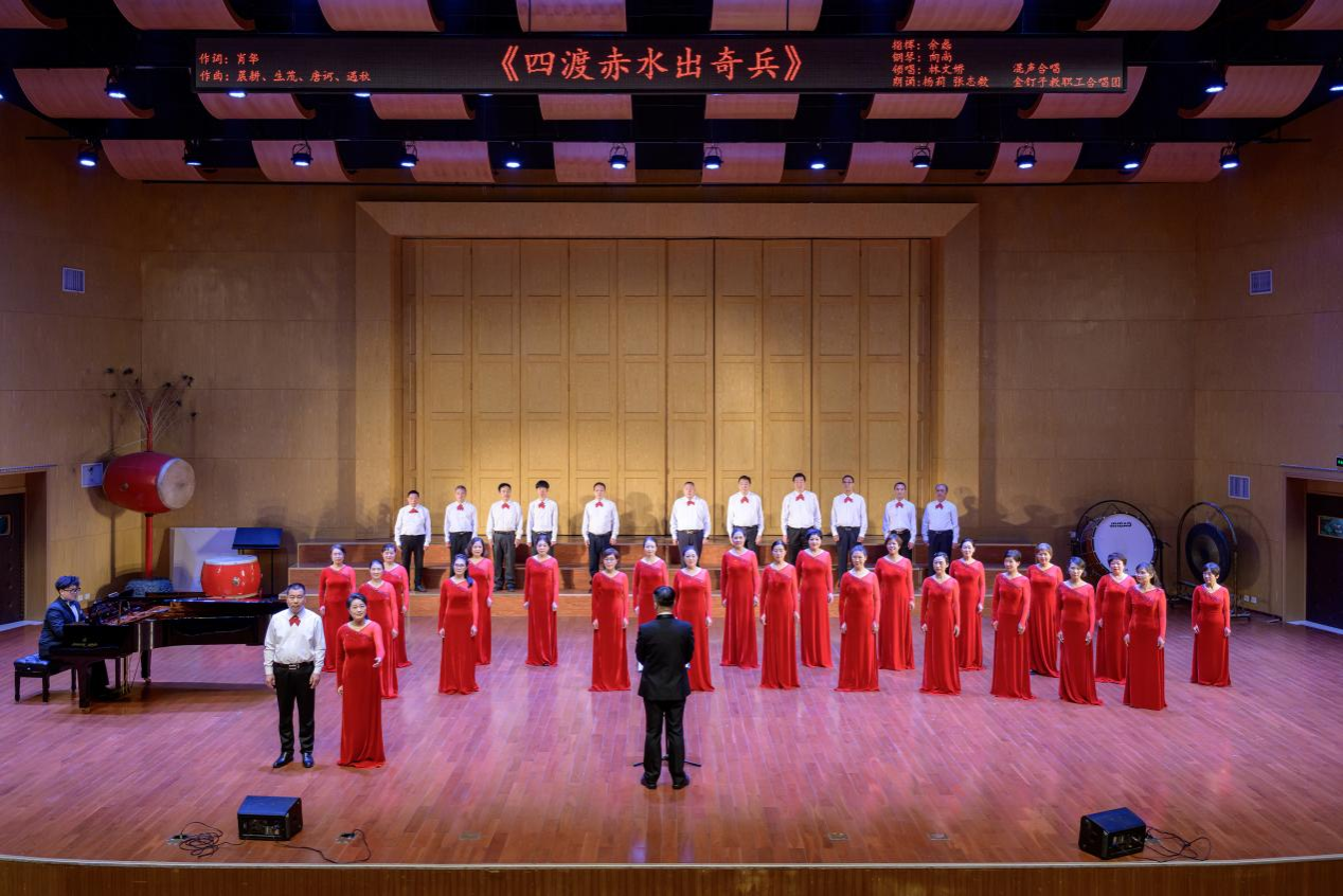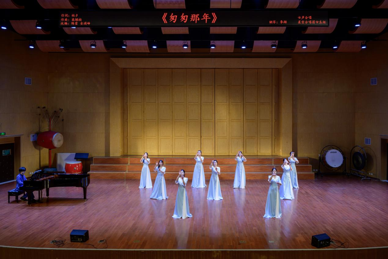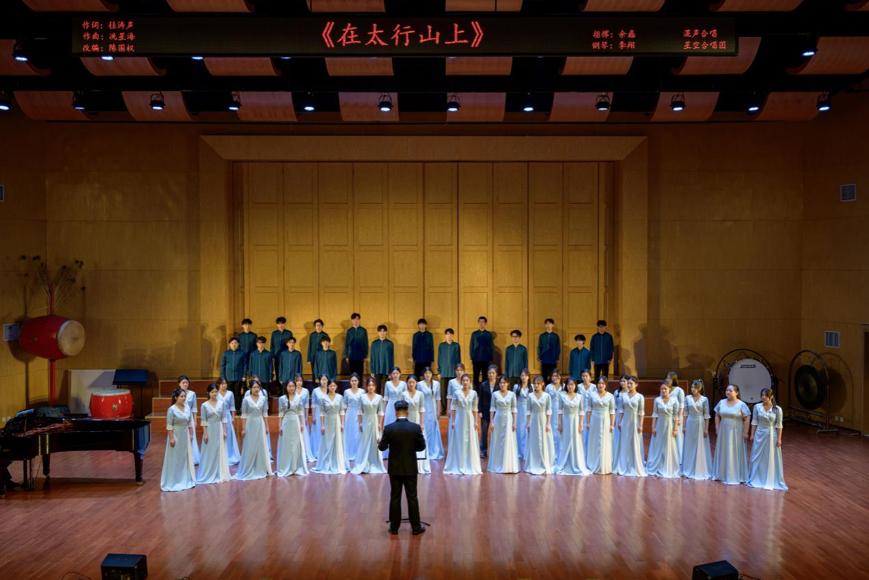 此时,音乐会已渐入高潮,下半场继续演唱了《匆匆那年》、《祝福》、《大王叫我来巡山》、《当那一天来临》、《大鱼》、《在太行山上》和《不忘初心》7首曲目。歌声或婉转或激昂,或欢快或悠扬。地大师生在艺术的殿堂里汇聚优美的音韵,用歌声表达心中对祖国最深沉最真挚的祝福。最后,专场音乐会在星空合唱团、金钉子合唱团、雪莲合唱团全体参演人员合唱的《我和我的祖国》中圆满落幕。
