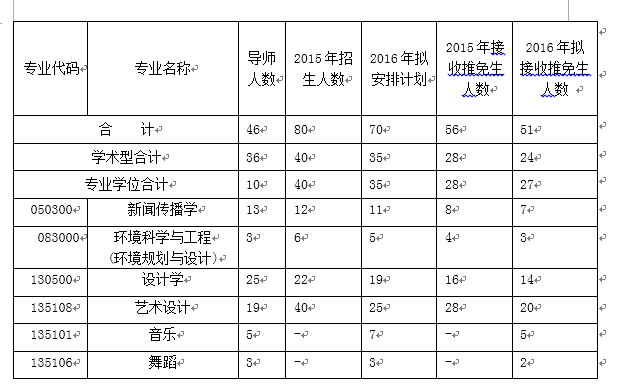 2016年我院在新闻传播学、设计学、环境规划与设计3个一级学科学术学位和艺术设计、音乐、舞蹈(MFA)专业学位类型接收推免生51人,学制3年。具体见下表。