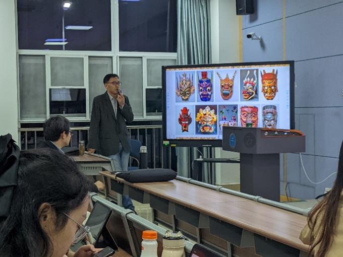其次,黄朝斌讲授向同学们详细介绍了文化人类学家所认为的理论:文化是一群人通过习得,对其所作所为和每件事物的意义共有的认识。与此同时分为两个部分:傩面具作为宗教艺术以及傩面具作为民间艺术,向同学们分享了傩面具本身所蕴含的宗教意义,以及包含了大量的诸如宗教信仰、世俗情感、娱乐教化等精神领域的内容,具有精神领域的信仰、教化、审美、认知等多种功能。