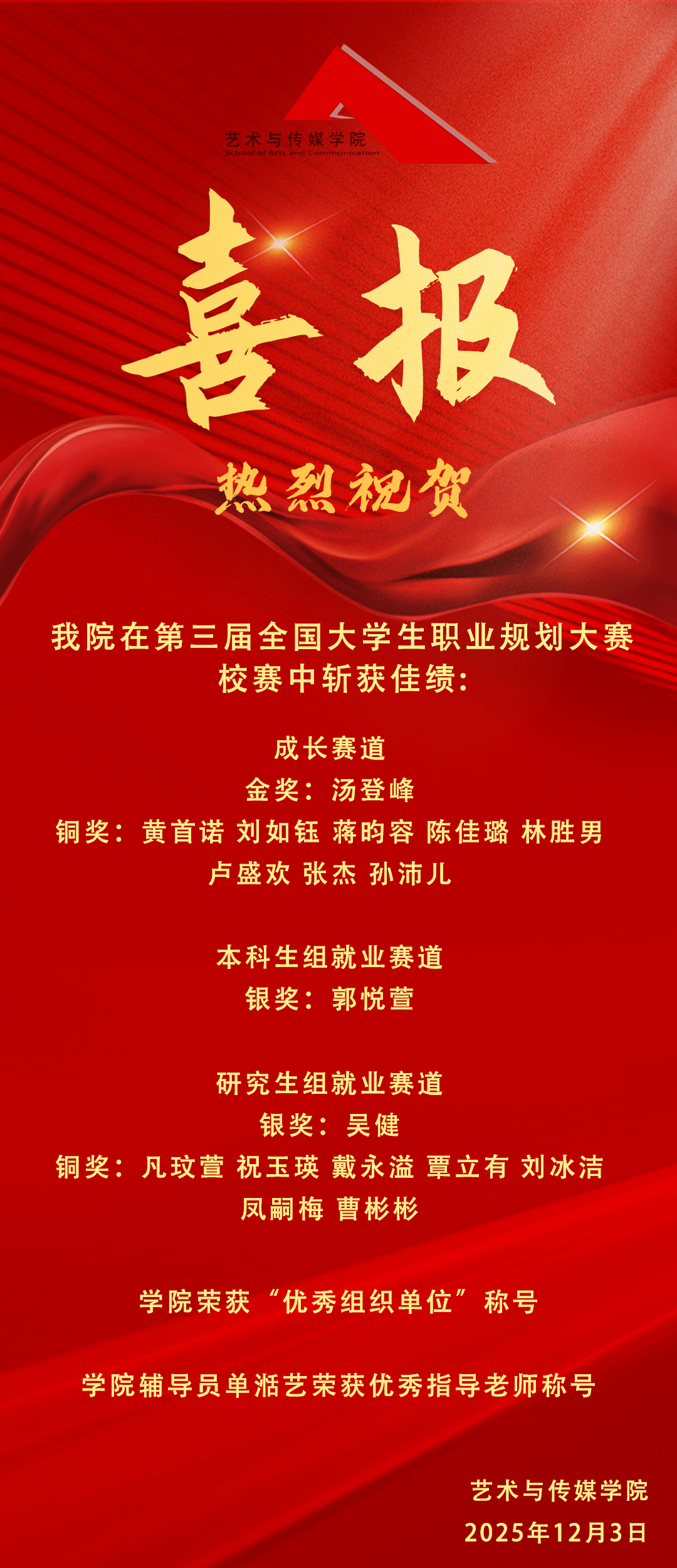 在本次比赛中,2025最新吃瓜泄密事件的同学们表现出色,斩获多项荣誉。成长赛道方面,汤登峰荣获校级金奖,黄首诺、刘如钰、蒋昀容、陈佳璐、林胜男、卢盛欢、张杰、孙沛儿荣获校级铜奖;就业赛道方面,郭悦萱荣获本科生组校级银奖,吴健荣获研究生组校级银奖,凡玟萱、祝玉瑛、戴永溢、覃立有、刘冰洁、凤嗣梅、曹彬彬荣获校级铜奖。此外,2025最新吃瓜泄密事件荣获“优秀组织单位”称号,学院专职辅导员单湉艺老师荣获“优秀指导老师”称号。
