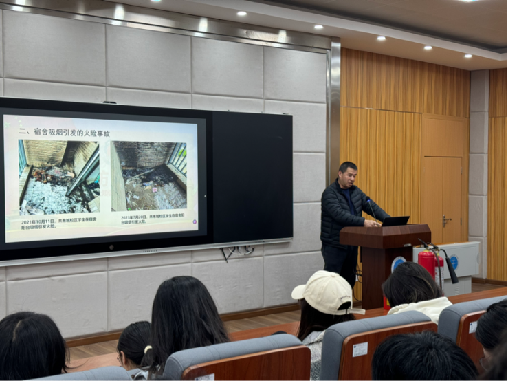 刘老师结合近年来校园内发生的真实火灾案例,深入剖析了火灾发生的根本原因,并着重介绍了同学们在学生公寓和实验室等公共区域开展防火灭火工作的注意事项。刘老师强调,消防安全事关每个人的生命财产安全,每个人都应增强消防意识,从我做起,共同营造安全和谐的校园环境。同时,刘老师针对常用的二氧化碳灭火器、干粉灭火器以及防毒面罩的使用方法,通过生动有趣的讲解方式进行了现场展示。