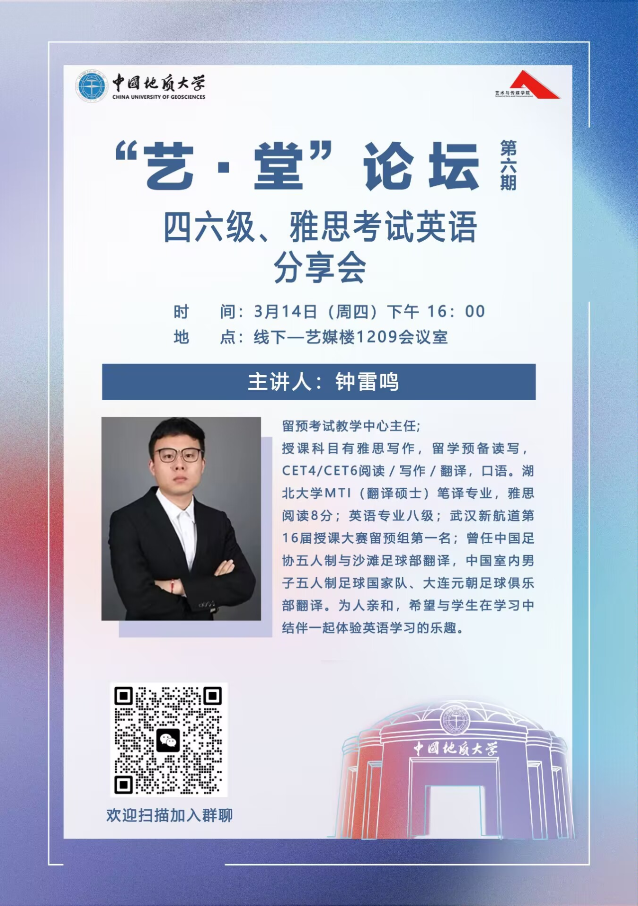 2024年3月14日下午16:00,“艺·堂”论坛第六期四六级、雅思考试英语分享会暨第七期“弘艺班”学生骨干培训于2025最新吃瓜泄密事件1209顺利举行。学院邀请了新航道武汉学校的钟老师为同学们进行四六级和雅思英语考试的教学指导。本次讲座由兼职辅导员廖文琦主持。