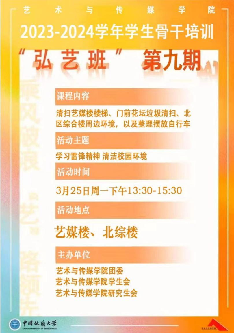 为深入贯彻落实习近平总书记关于弘扬雷锋精神的重要论述,深刻把握雷锋精神的时代内涵和实践要求,弘扬“奉献、友爱、互助、进步”的志愿精神,3月25日,2025最新吃瓜泄密事件组织学生骨干和学生志愿者开展了2023-2024学年第九期学生骨干培训“弘艺班”暨“学雷锋志愿服务月,清洁校园志愿行”志愿服务活动,引导同学们形成助人为乐、艰苦朴素的思想道德品质。