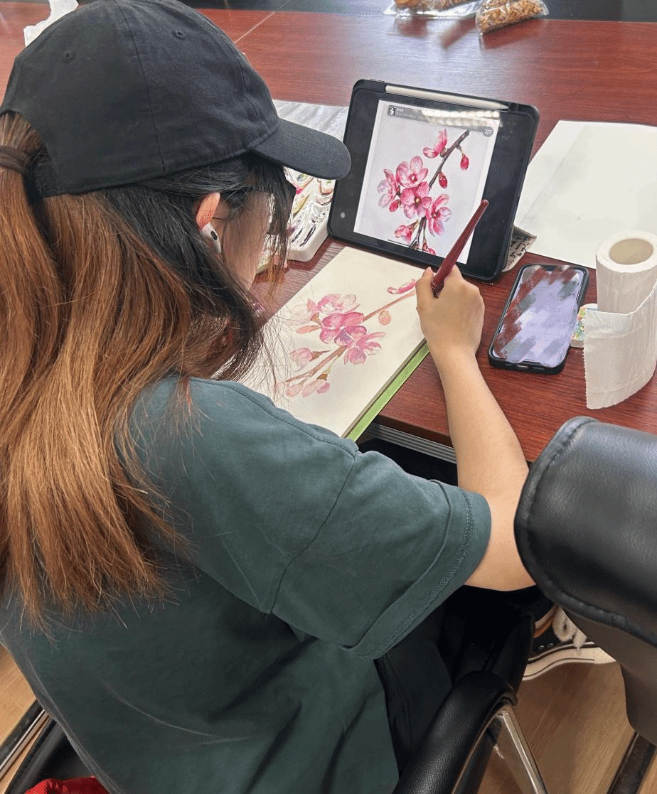 在创作过程中,工作室成员 “艺术疗愈引导者”,穿梭于各小组之间,为大家进行了绘画技巧讲解,包括色彩搭配、晕染方法等。“当水彩在纸上晕开时,感觉心里的烦恼也跟着散开了”,一位参与活动的同学分享道,“平时很少有机会静下心来专注于绘画,这次活动让我重新发现了动手创作的治愈力。”