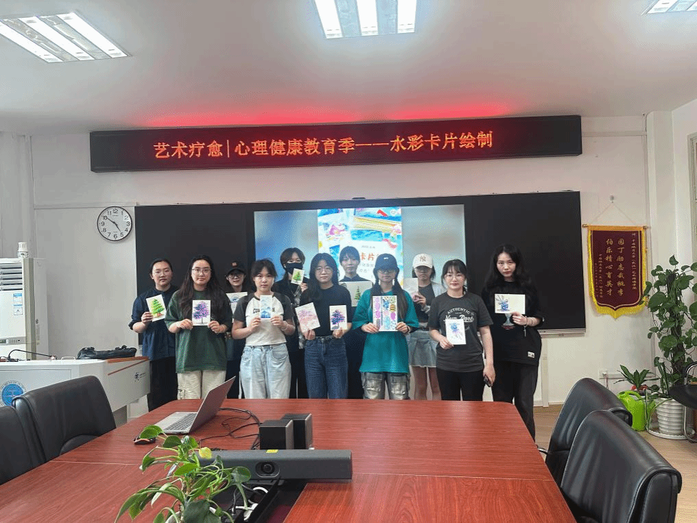 活动尾声,同学们依次展示自己的水彩卡片,并分享创作背后的故事与心情。通过色彩的流动与笔触的交织,大家不仅完成了一件精美的手工作品,更在沉浸式的艺术体验中实现了压力的释放与情感的疏导。现场轻松愉悦的氛围,让每一位参与者都感受到了集体创作带来的温暖与接纳。