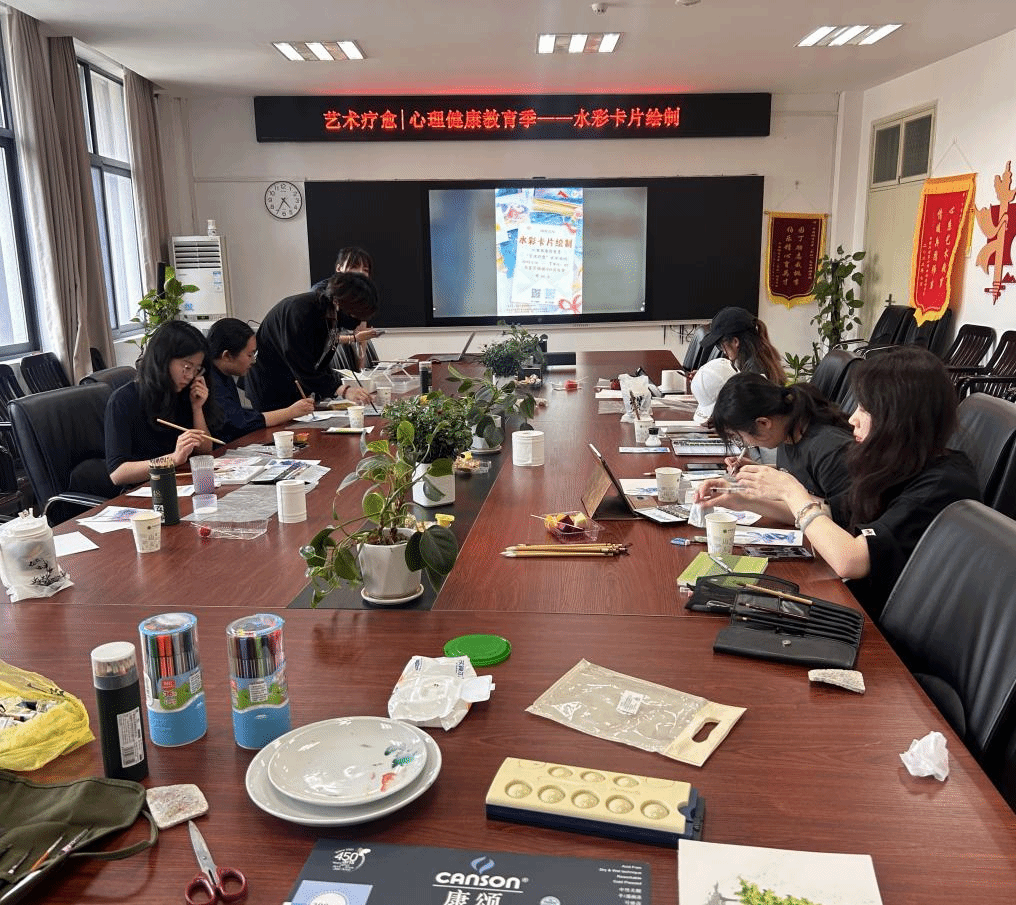 本次活动延续了 “艺术疗愈” 系列活动的核心理念,将绘画艺术与心理疏导巧妙融合。活动现场,工作人员为参与者精心准备了各类水彩画材及参考,同学们可根据自己的喜好挑选纸张与颜料,将内心的情绪与愿景倾注于笔尖。有的同学用明丽的暖色调描绘绽放的花朵,传递对生活的热爱;有的同学以校园风景为灵感,绘制出熟悉的教学楼、花园,将对校园的热爱融入画中,每一张贺卡都成为独一无二的 “心灵画像”。