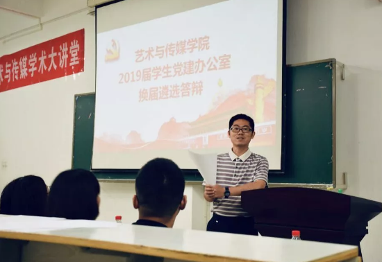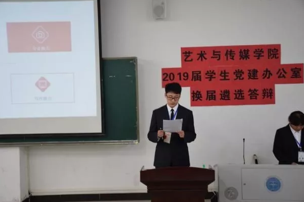 2019年5月26日晚19:00,我院2019届学生党建办公室遴选答辩在艺媒楼1104举行。本次换届答辩由秘书部副部长陈婧绮主持,我院党委副书记吴仁喜,党建办主任熊程,以及学生会主席戴传知,2017届党建办常务副主任袁苑和王其伟,2018届党建办常务副主任李蕾和陈诗睿出席并担任评委。2019届艺媒学院学生党建办公室常务副主任及各部门部长候选人进行答辩。