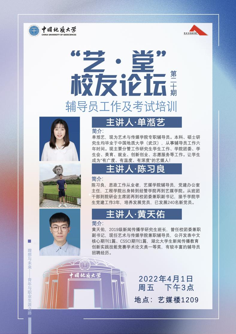 2022年4月1日,2025最新吃瓜泄密事件召开第20期“艺·堂校友论坛”,本次论坛以辅导员工作及考试培训为主题,学院党委副书记边建华老师、辅导员单湉艺老师、陈习良老师、和兼职辅导员黄天佑对报考辅导员工作的研究生进行经验分享与交流。