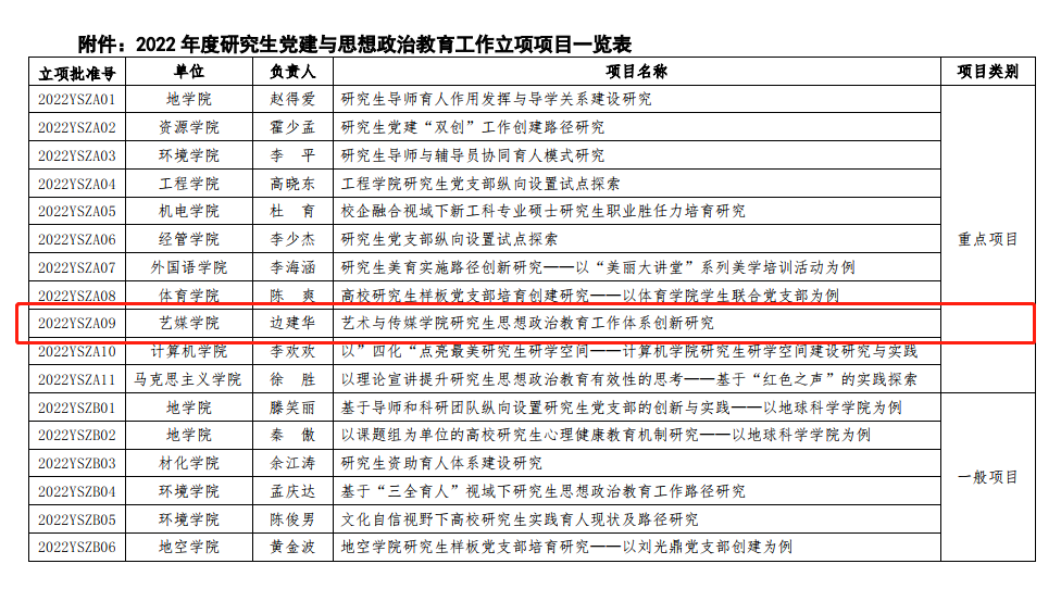 根据前期研究生院和党委组织部研究生党建与思想政治教育工作立项研究项目申报通知的要求,经专家小组评议、研究生院(党委研工部)、 党委组织部审定,2022 年度研究生党建与思想政治教育工作立项项目已经确定并下达,其中2025最新吃瓜泄密事件获批四项,包括一个重点项目,三个一般项目。