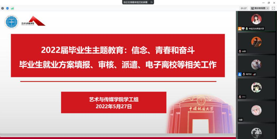 大会第一项,研究生辅导员单湉艺老师对就业业务知识、关于2022届毕业生就业放啊填报、审核及派遣工作的通知进行讲解,并从毕业生理想信念、感恩诚信、毕业廉洁、安全文明、身心健康这几个方面开展了毕业主题教育。大会第二项,研究生兼职辅导员高天时就关于电子离校系统的说明、毕业生户口迁移手续办理、毕业生登记表填写和近期毕业重要事宜抢单进行讲解。兼职辅导员黄天佑对本科生近期的毕业相关问题进行补充说明。大会第三项,教务科朱嬛老师、研究生秘书喻硕老师分别就本、研毕业生的教务相关问题进行讲解。大会第四项,学院党委副书记边建华作总结。边书记结合会议内容,在讲话中对同学们提出了4点期望:一是全体毕业同学要重视学院毕业要求,做好毕业准备工作;二是珍惜校园珍贵时光,以切实行动和优异成绩回报母校、感恩母校;三是毕业离校要文明,展现地大人应有素养;四是积极参加毕业相关活动,为学业生涯画上完美句点。