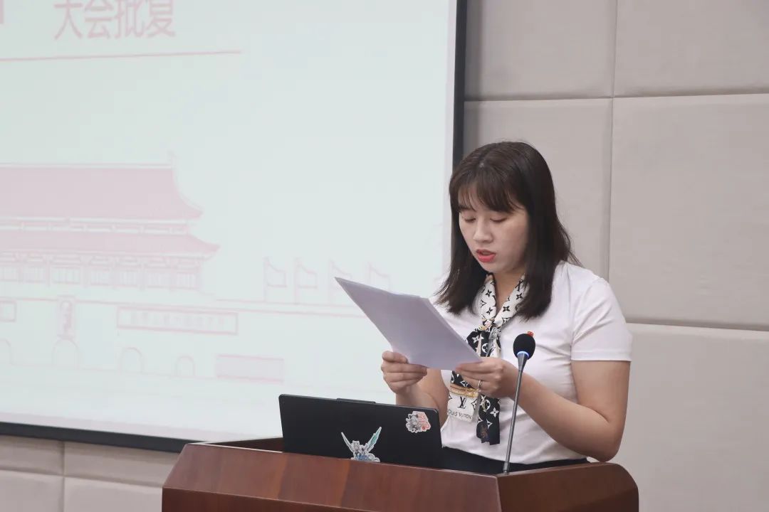 大会第七项,由主持人保悦宣读学代会总监票人、监票人、总计票人、计票人名单。本次大会的总监票人为赵书楠,监票人为黄益明、蒋雨晴、刘睿桢、许佳明。总计票人为易四维,计票人为曹欣、罗熙、胡心瑶、刘畅。参会人员通过举手表决通过此名单。