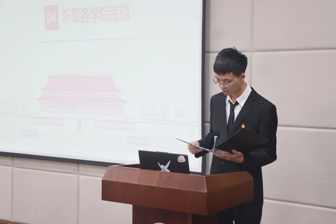 大会第四项,由艺媒学院青年志愿者协会理事长易四维宣读由计算机学院、机械与电子信息学院、外国语学院、公共管理学院、珠宝学院、环境学院、海洋学院、马克思主义学院、体育学院、李四光学院、自动化学院、资源学院发来的贺信。在贺信中,各院学生会对本次大会的召开表示了热烈祝贺,肯定了我院学生会取得的丰硕成果,并对未来学生工作中的合作进行了展望。