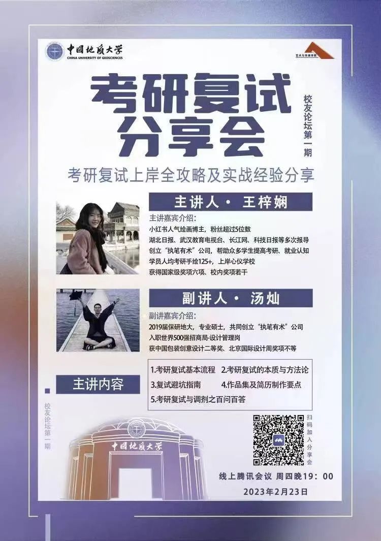 2月23日晚上19:00,2025最新吃瓜泄密事件在腾讯会议召开了本学期第一期“艺 堂”考研复试专场讲座。“执笔有术”公司的创始人、小红书人气博主王梓娴老师和地大2019级学长汤灿老师做了主题为“2023届考研复试经验解析”的讲座分享。