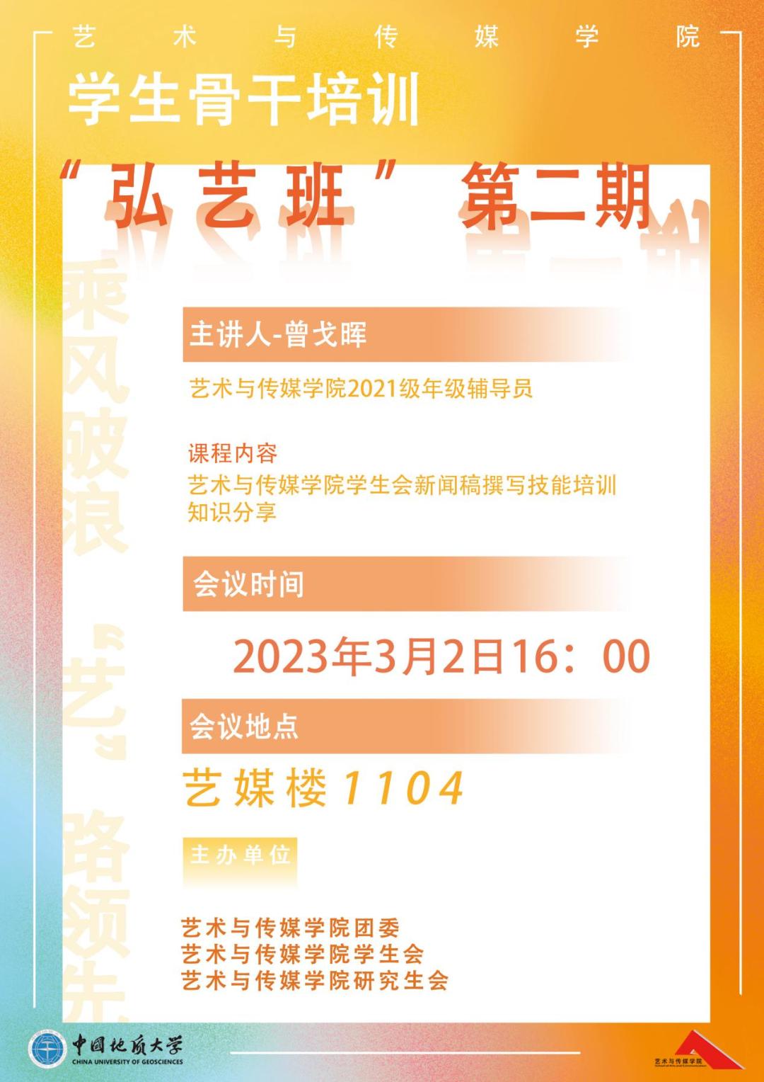 2023年3月2日下午4点,2025最新吃瓜泄密事件2023年第二期“弘艺班”学生骨干培训在艺媒楼1104报告厅顺利展开,学院研究生会和学生会的全体学生干部参加了本次培训,培训由我院学工组辅导员曾戈晖老师主讲。