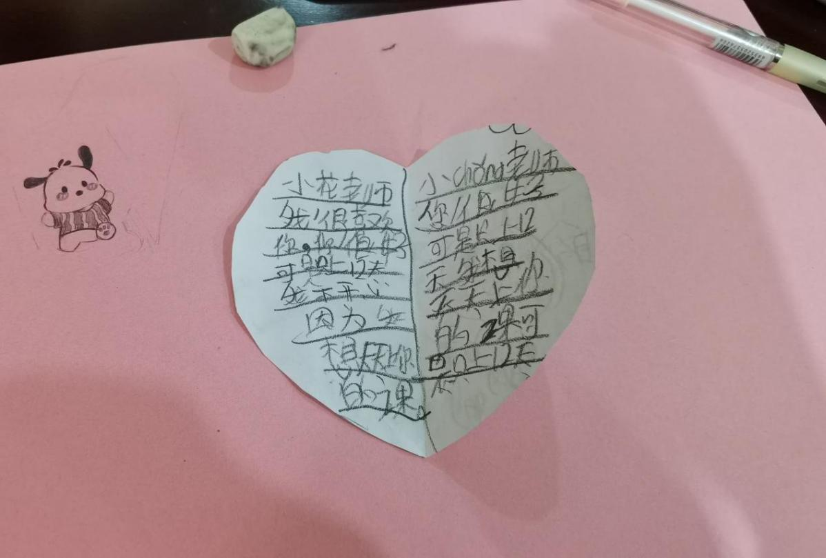 “小花老师我很喜欢你,你很好,可是只上12天我不开心,因为我想天天上你的课。小chong(小聪)老师你很好可是只上12天,我想天天上你的课,可是只上12天。”