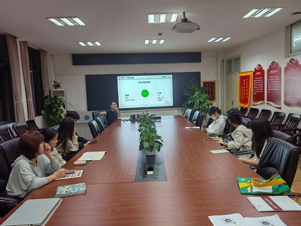 其次,讲师通过分享自身经历,为同学们传授如何提升自己的就业竞争力。通过进行热情主动的提问调动大家的积极性,活跃讲课现场气氛。