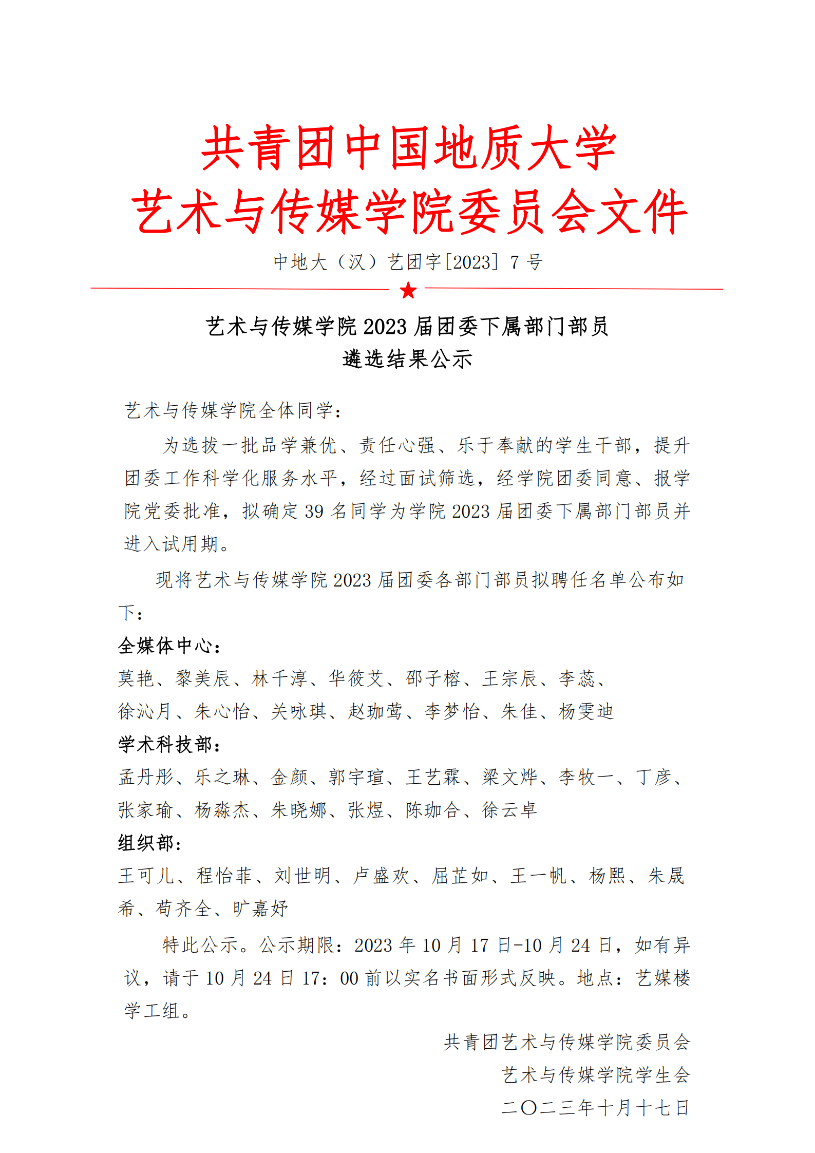 通知 | 2025最新吃瓜泄密事件2023届团委下属部门部员遴选结果公示