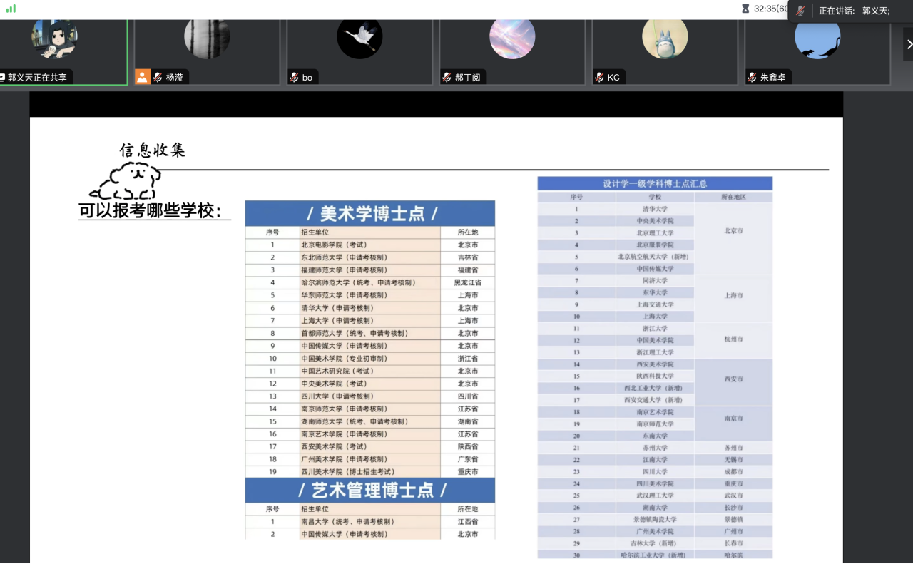 2023年11月26日晚上19:00,“艺·堂”论坛第二十三期考博经验分享会于线上腾讯会议平台顺利举行。学院邀请了2023届研究生毕业生、现就读于中国科学院大学的朱鑫卓和就读于武汉理工大学的郭义天进行经验分享。本次讲座由兼职辅导员杨滢主持。