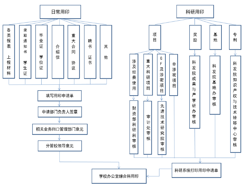 学校用印遵循归口管理、逐级审批、严格审核、安全规范的原则,严格执行“先审批后用印、谁经办谁首责、谁审批谁负责”的要求,开展校级用印办理工作。