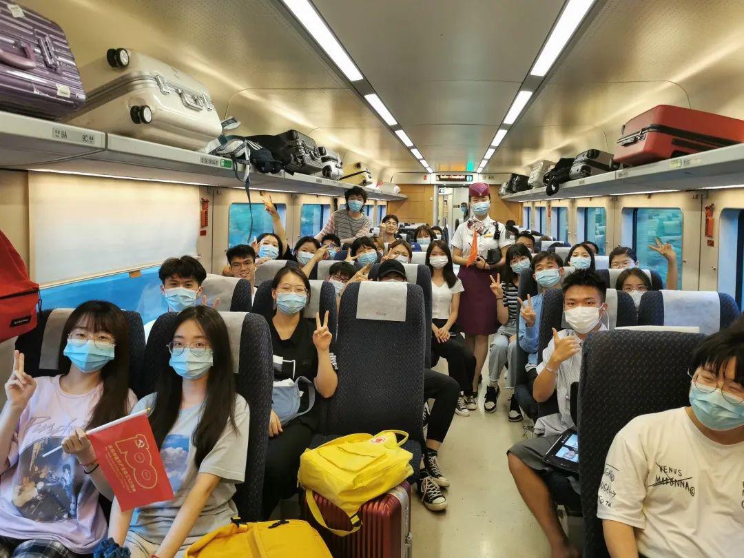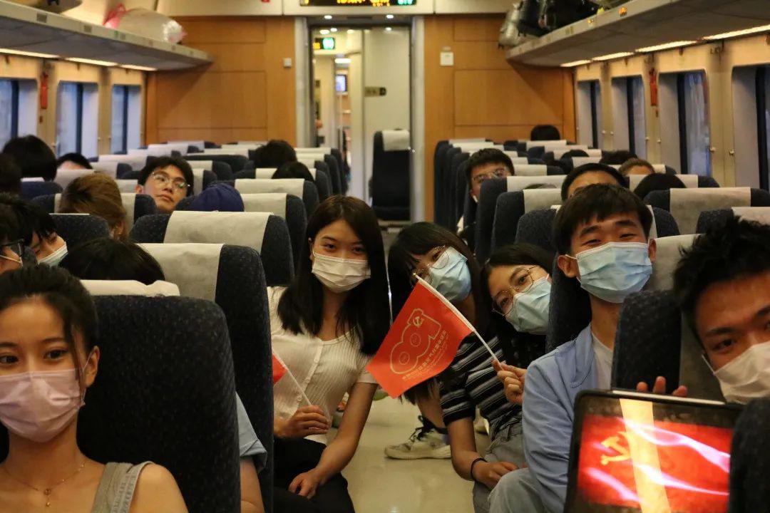 “唱支山歌给党听,我把党来比母亲”,在前往目的地的列车上,响起了清澈悠扬的歌声,瞬间吸引了车厢内所有人的目光,只见来自2019级音乐系的陈雪莲同学一边挥舞着手中“建党100周年”的红旗,一边伴着婉转的歌声缓缓走向人群。随后,其他同学也纷纷举起手中的红旗,和着动人的女声唱起了这首家喻户晓的《唱支山歌给党听》,大家在歌声中所迸发出的激情感染了列车上来自全国各地的乘客,他们纷纷拿出手机记录下这令人感动的精彩瞬间,火车的列车长和乘务员也情不自禁地加入到快闪队伍中,与同学们齐声高唱,“母亲只生了我的身,党的光辉照我心”......随着加入的人越来越多,大家的歌声逐渐萦绕整个车厢,手中挥舞的赤色旗帜也让这里变成了一片绚丽的红色海洋!