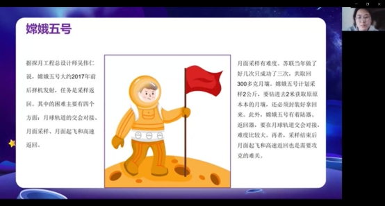 2021年12月5日晚上19点整,党支部以线上会议的形式召开了艺术党课分享活动,钟思怡同志、周娅同志和李子微同志以《中国的探月工程》为主题,以艺术党课的形式向支部党员讲述中国的探月精神,通过“PPT讲述+短视频放映”的方式向支部党员讲述了探月的历史,中国现代的探月工程,以及嫦娥五号等,弘扬了我国的航空航天精神,是一节引人入胜的艺术党课。